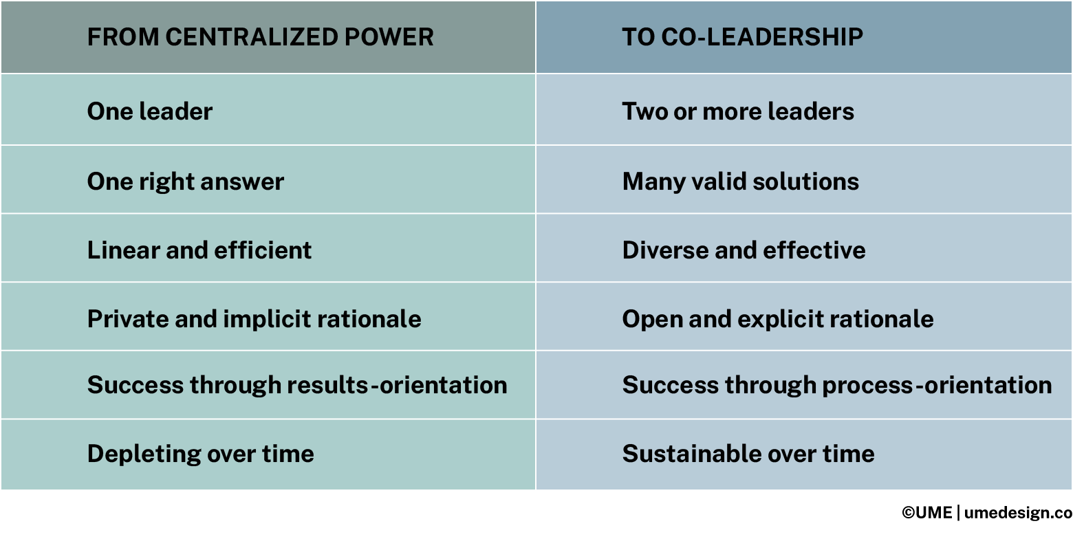 The belief that “a right answer” exists is a byproduct of centralized power — where the boss’ view becomes the right view. In contrast, co-leadership is rooted in humility and grounded in the worldview that there is no one right answer but instead many valid perspectives, approaches and ways forward. It embraces possibility over certainty and asks us to relinquish the idea of control and lean into our differences. This can be unfamiliar territory, especially for highly intelligent and successful experts, academics, and leaders.