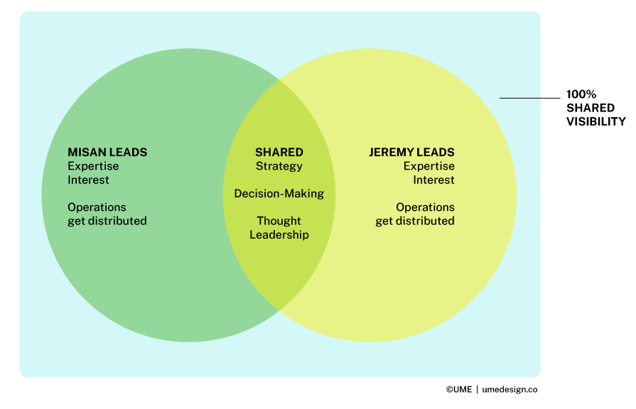 The specific structure that emerged for Misan and Jeremy is one of shared visibility, decision-making and thought leadership across all work. After weeks of rolling up their sleeves together, they were able to explicitly corroborate each other’s strengths and challenges, areas of expertise and interests — and distribute operational responsibilities accordingly. This strategic division of labor allows them to focus on what they know and love, and share the responsibility of everyday operations.